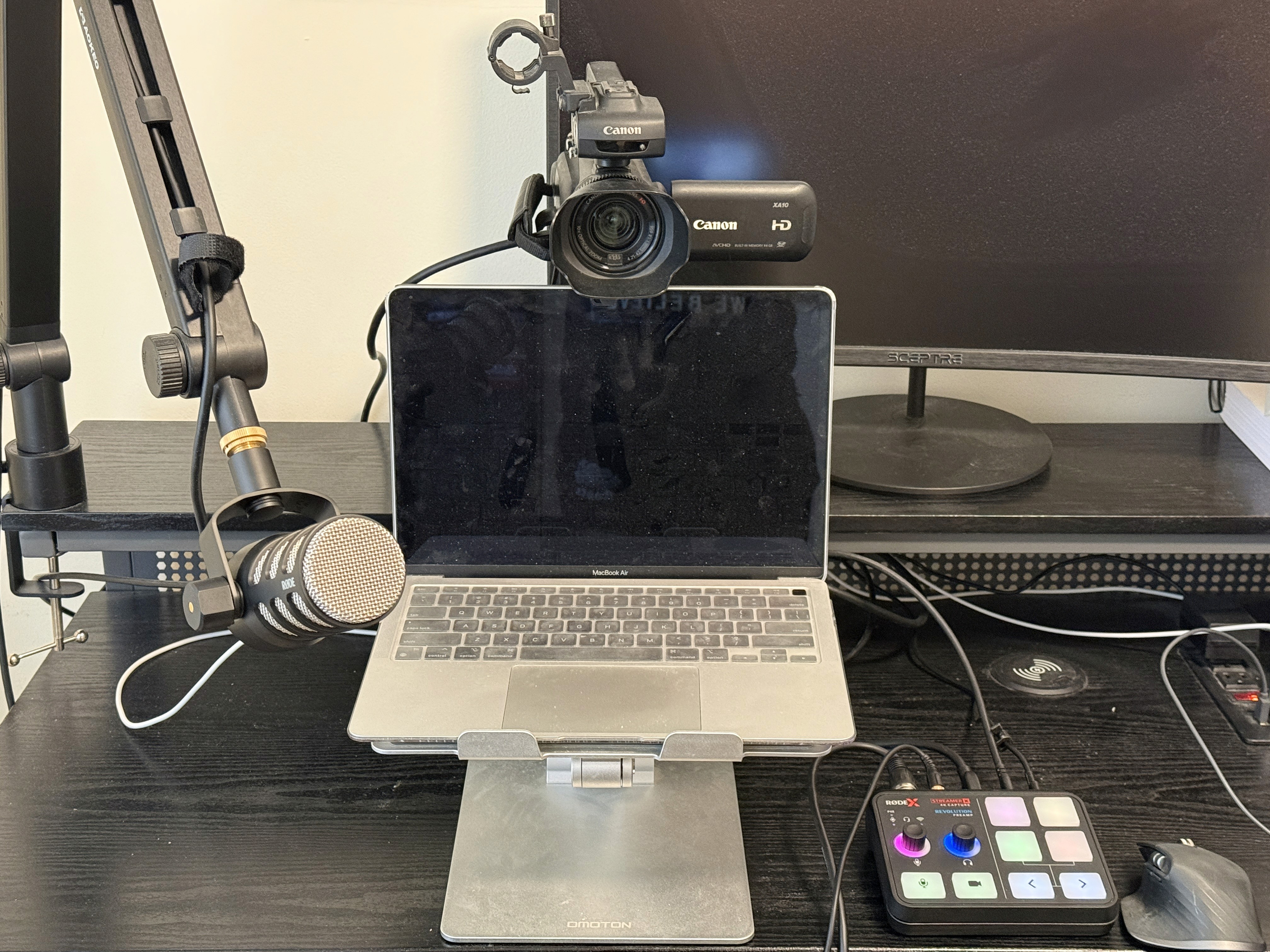 Other gear? Otherwise I just have an Amazon XLR cable to connect the mic to the board, an arm mount I found on Amazon that works with my existing desk and an Amazon HDMI C cable that works with my camcorder (not to be confused with USB C).