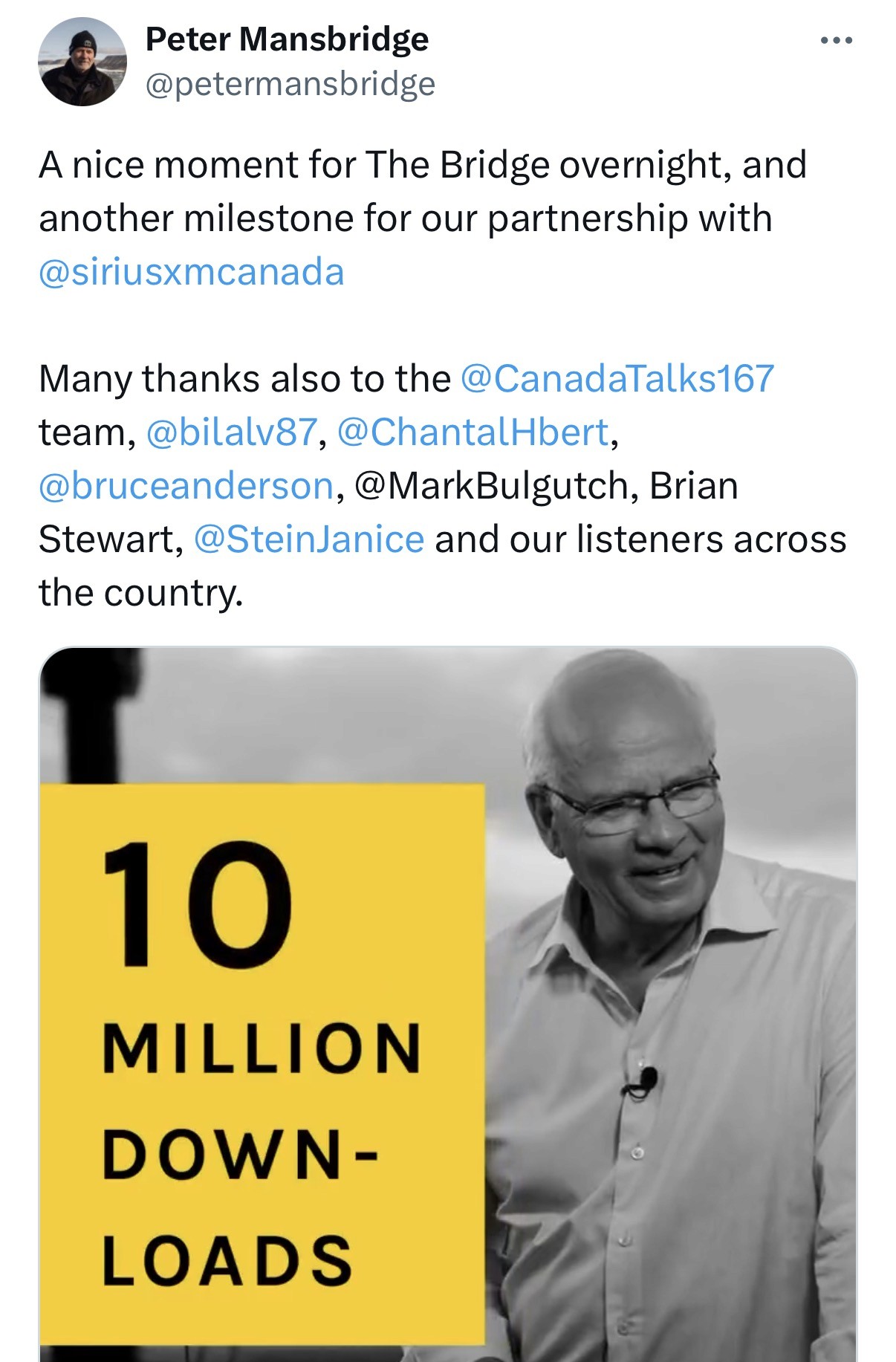 TSN, TSN 1050 and SiriusXM Canada in roles ranging from Story Editor, Senior Producer, Reporter, Host and more. I have worked with the likes of Peter Mansbridge, Bob McCown, Jessi Cruickshank among others. Don’t believe me? Well I was the first person Peter Mansbridge tagged me when he reached 10 million downloads! He went on to reach over 17 million while working with me. I have had clips from my own SiriusXM show reach up to 133k (others at 100k) such as this one below.